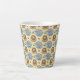 A tall white mug features a colorful pattern