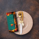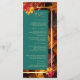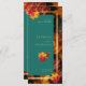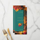 Elevate your wedding reception with our exquisite wedding menu. This captivating design features a vibrant teal backdrop adorned with a shimmering gold frame and surrounded by autumn leaves. The couple's names, wedding date, and venue location are elegantly displayed within the frame, setting the stage for a memorable culinary experience.