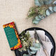 Guide your guests through your special day with our exquisite wedding program. This captivating design features a rustic backdrop of autumn leaves, complemented by a shorter, teal panel adorned with a shimmering gold frame and surrounded by autumn foliage. The couple's names are prominently displayed in bold typography, followed by the wedding date and venue location.