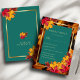 Make your wedding planning effortlessly stylish with our exquisite RSVP card. This elegant design features a Teal backdrop adorned with a shimmering gold frame, gracefully encircled by vibrant autumn leaves. The phrase "Kindly Reply" is displayed in bold, elegant typography, drawing attention to the RSVP due date. Guests can easily indicate their attendance with clear options for "Joyfully Accepts" or "Sadly Declines," followed by meal choices for a streamlined response process.