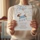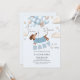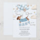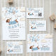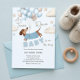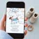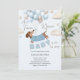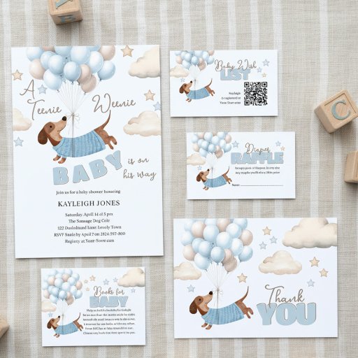 Adorable dachshund themed boy baby shower invitation illustrated with a cute dachshund wearing a blue sweater, floating amongst a bunch of soft blue and beige balloons. Playful clouds and stars add to the whimsical theme. The playful text 'A Teenie Weenie Baby is on his way' perfectly complements the theme. This invitation is sure to bring smiles whilst evoking a gentle, joyful vibe.