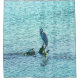 A minimalism photograph of a Heron perched on a tree that has not fully submerged under the water. The surface of the water is disturbed by the wind and ripples create a blue textured backdrop.