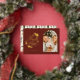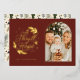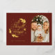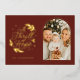 A modern red and gold foil religious arch photo holiday card with "A Thrill of Hope" in hand lettering style font . On the reverse is a pattern of green and navy holly and pine leaves.