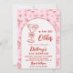 Featuring a soft blush pink background with a bold red martini illustration tied with a delicate bow, this invitation blends vintage charm with modern femininity. The arched frame layout adds a refined touch, while the hand-drawn cocktail, champagne, and bow pattern creates a cohesive, stylish look that feels elevated and trendy. The mix of elegant script and clean serif typography makes it ideal for sophisticated birthday dinners, cocktail lounges, girls’ nights, martini bars, or at-home celebrations.