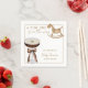 A Tini One is On The Way Espresso Martini Baby Shower Napkins - A unique and adorable baby shower napkins with an espresso martini adorned with a mocha brown coquette bow and a vintage wooden baby rocking horse toy, both watercolor illustrations. Elegant, handwritten script font alongside sleek block font in brown tone. Edit these baby shower napkins template with your own event details.