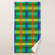 A towel set and washcloth display vibrant rainbow stripes, featuring reds, greens, blues, and yellows. The scene exudes a colorful, cheerful vibe.