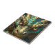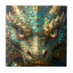A tile with an illustration of a gold and turquoise metallic looking dragon. Add some dark fantasy art to your backsplash or craft project.