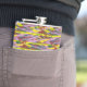 The design you provided features a pattern consisting of horizontal stripes in various colours, including yellow, green, purple, and pink. Between these coloured stripes are thinner white stripes. Each coloured stripe is adorned with a sequence of small dots that are evenly spaced along the length of the stripe. The dots appear in contrasting colours to the stripe they are on, such as white dots on the purple and green stripes and black dots on the yellow and pink stripes. This repetitive pattern creates a visually stimulating texture that could be used for backgrounds, textiles, or other design elements due to its vibrant colours and rhythmic dot sequences.