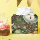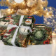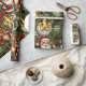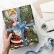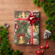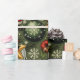This Christmas wrapping paper features a repeating pattern of festive holiday characters and ornaments on a dark green background. The design includes: