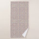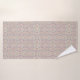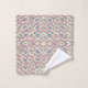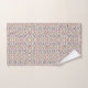 A vibrant, colorful towel hangs on a rod, featuring a psychedelic pattern of swirling shapes in pink, blue, green, and yellow. The design is lively and intricate.