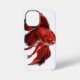 The primary subject is a Betta fish, predominantly red, with intricate fins that display a flowing, graceful form. The fish has characteristic features, including a small, pointed head with a visible eye. The fins are long and flowing, with some areas highlighted with white or light blue, enhancing the dynamic effect of movement. The scales are meticulously rendered, adding to the realism and showcasing the play of light. The mouth is slightly open, as if the fish is in motion, adding to the feeling of life and movement.