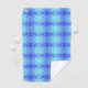 A vibrant towel featuring a symmetrical pattern of blue and teal colors, resembling a kaleidoscope. The design is filled with small white dots, creating an energetic and refreshing feel. A small round tag is attached to the top left corner.