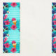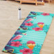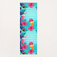 A vibrant yoga mat features a playful tropical design with colourful ice cream cones, refreshing drinks, and bright pink hibiscus flowers. The background is a soothing aqua with subtle stripes, enhancing the lively elements.