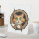 This image features an orange cartoon cat with bright green eyes and a cheerful, playful expression. The cat is peeking through a round wooden hole, displaying a curious and whimsical demeanour. The wooden frame is detailed with cracks and textures, adding a touch of realism, while the overall design remains vibrant and full of life