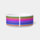 A white ceramic bowl features colorful zigzag patterns in pink, blue, green, and orange, creating a lively and vibrant design against a plain background.