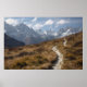 Photograph-like painting of a winding path ascending through a meadow in the foothills of a snow-covered rocky mountain range.