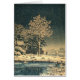 A Winter Day on Sumida River in Japan by Tsuchiya Koitsu --- The crisp winter air hung heavy over the banks of the Sumida River. Snow, a blanket of pristine white, muffled the sounds of the bustling city. A lone figure, a woman in a vibrant kimono, her face obscured by a traditional umbrella, hurried along a snow-dusted path. Her destination: a quaint wooden house nestled amidst the quietude of the Suijin Woods. --- This scene, a masterpiece by the renowned artist Tsuchiya Koitsu, captures the essence of a bygone era in a rapidly changing Japan. A mighty tree, its branches heavy with snow, stands sentinel in the centre, its reflection shimmering on the still waters of a nearby pond. The Sumida River, a silent witness to the passage of time, snakes its way through the image. --- On the left bank of the Sumida River, near the Suijin Woods, the tranquillity reigns supreme. The woman's presence, her colourful kimono a stark contrast to the muted tones of winter, hints at a life steeped in tradition. Smoke curling from the chimney of the old house, partially obscured by the trees, speaks of warmth and a simpler way of living. --- Across the river, to the right, a different story unfolds. Buildings, stark and industrial, pierce the horizon in the distance. Smoke billows from their chimneys, a testament to the relentless march of progress. Here, the artist paints a picture of a new Japan, one driven by the wheels of industry. --- The central tree serves as a powerful metaphor, its snow-laden boughs dividing the old from the new. Yet, the scene is not one of stark division. The woman, caught between the two worlds, embodies the hope for a harmonious coexistence. Perhaps she represents a bridge between the past and the future, a testament to the enduring spirit of tradition even in the face of change. --- Tsuchiya Koitsu's masterful use of colour reinforces the narrative. The blues of the water evoke a sense of serenity, while the greys and whites of the snow and sky create a peaceful winter atmosphere. The woman's vibrant kimono, a splash of colour against the muted backdrop, underscores the enduring power of tradition. --- "A Winter Day on Sumida River in Japan" is more than just a landscape; it's a poignant reflection on a nation in flux. It's a reminder of the beauty of the past, the relentless march of progress, and the enduring hope for a future that embraces both. --- This 1949 artwork by Tsuchiya Koitsu (1870—1949) is in the public domain in its country of origin and other countries and areas where the copyright term is the author's life plus 70 years or fewer.