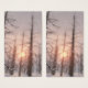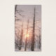 A pale winter sun sets behind towering larch trees like dark sentinels. Their gnarled branches, bare except for a dusting of snow, and the pastel golds, pinks, and blues of the sunset sky are seen as through a dreamy haze. In the foreground snowflakes are softly falling.