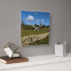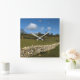 An ancient dry stone wall crosses green fields under a perfect blue sky with fluffy white clouds.