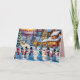 This whimsical Christmas card captures the enchantment of the holiday season with a playful, snowy landscape. The front features a charming village adorned with twinkling lights and colourful decorations, where snowflakes gently fall from a twilight sky. Cheerful snowmen in top hats and scarves frolic amidst pine trees laden with snow. In the foreground, a group of children bundled up in festive gear joyously build a snowman, while a cosy cottage emits warm, golden light through its frosty windows. The card is framed with elegant borders of holly and berries, perfectly encapsulating the magic of a Christmas wonderland.