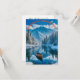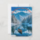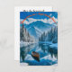 The card features an enchanting winter scene, where a tranquil river weaves through a snowy landscape adorned with towering pine trees dusted in frosty white. In the background, the majestic snow-capped mountains stand proudly under a clear, bright blue sky, exuding a sense of serenity. A quaint wooden boat floats gently on the still, mirror-like water, perfectly reflecting the idyllic surroundings. The whimsical atmosphere invites you to embrace the magic of the season.