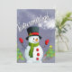 This is a illustration that is digital with a cute snowman wanting to invite you to a wonderful Christmas dinner. There is snow with presents and Christmas trees.
