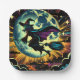 Halloween party paper plates. . Grab your broom and fly over! Spooky witch flying on a broom in front of a full moon graphics done in a comic book pop art style.