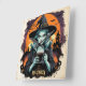 A mysterious witch stirs a bubbling cauldron as her black cat watches, all framed by a glowing full moon and a backdrop of spooky trees at twilight.