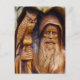 A wise old wizard, witch or warlock with a wavy beard and wearing flowing robes stands in a cave entrance with his sceptre or staph and an owl on his shoulder. Colour photo of finely detailed, artwork carved in wood.