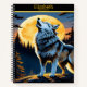 Under the luminous glow of a full moon, a majestic wolf howls atop a rocky perch, surrounded by tall pine trees. The night sky casts a magical atmosphere, blending shades of blue and orange, enhancing the creature's wild beauty and spirit.