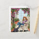 A pretty postcard to keep in touch with a friend of family member. A fun comic book illustration of a woman sitting on her lawn chair on her patio, with her cat, a cup of coffee or tea and surrounded by purple clematis and hanging plants.
