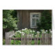 A photograph showing a wooden rural hut with a window and a garden full of white roses.