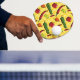 A peri-peri, friggitello, habanero, rocoto, jwala, and shishito chilli pepper are decorated with patterns from the region where they were originally cultivated or are commonly eaten and sit on a yellow background with patterns inspired by tattoos worn by native peoples in the Amazon to create a fun repeating pattern that reflects the origins and spread of these tasty, and often spicy fruits.
