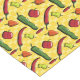 A peri-peri, friggitello, habanero, rocoto, jwala, and shishito chilli pepper are decorated with patterns from the region where they were originally cultivated or are commonly eaten and sit on a yellow background with patterns inspired by tattoos worn by native peoples in the Amazon to create a fun repeating pattern that reflects the origins and spread of these tasty, and often spicy fruits.
