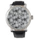 A wristwatch with a detailed gear-patterned face and a silver case, paired with a black leather strap. The back shows engraved branding.