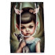 Lost in a world of imagination and love. A young girl is holding a deer in her arms. The girl is wearing a blue dress and has a pair of horns on her head. The scene is set in a forest, with trees surrounding the girl and the deer