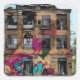 Abandoned urban building with pink and blue graffiti street art falling down and dilapidated. Post apocalyptic.