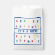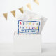 Design features the alphabet in bright, colourful stencil-lettering, just like that of the refrigerator magnets we all know! Your text is displayed in bright, blue letters across the centre of design. Also comes in red.