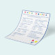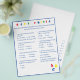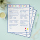 Design features a white background to a blue border and blue text. Title is displayed in bright colours. Questions are multiple choice and relate to development of Baby. The last question, however, is customisable and is personalised to the Mummy-to-Be. The stenciled letters, "ABC" are displayed at bottom, right corner in primary colours. Answers are found on back. Also available in red. Designed to coordinate with the "ABC Baby Shower Collection."
