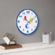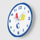 Design features the letters "ABC" in primary colours and large, stenciled font. Clock numbers are displayed in a blue, easy-to-read print. The 12, 3, 6 and 9 slightly larger than the rest of the numbers. Entire design is encircled in a blue border. Also available in red.
