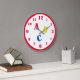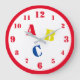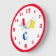 Design features the letters "ABC" in primary colours and large, stenciled font. Clock numbers are displayed in a red, easy-to-read print. The 12, 3, 6 and 9 slightly larger than the rest of the numbers. Entire design is encircled in a red border. Also available in blue.