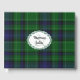 Plaid wedding guest book done in the classic Scottish green, blue, white and black Abercrombie clan tartan plaid pattern. A white decorative oval text area, on the front of the book, has custom text ready to personalise for your wedding.
