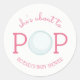 A baby shower sticker featuring text "she's about to POP" with illustration of a bubble incorporated into design.  Personalise the name.  Matching invitations and other items are available at Jill's Paperie.