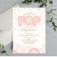 A baby shower invitation featuring an illustration of pink balloons with decorative text "She's about to POP" and confetti design. Personalise the text with details of your occasion.