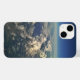 This phone case shows grey and white puffy clouds as seen through the window of an aeroplane. The beautiful evening sky shows light and dark blue layers in the horizon.
