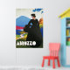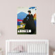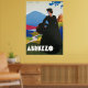This vintage advertising poster is for a region in Italy called Abruzzo. This is a more contempory design done in blues, red gold an black. A woman stands in the forground dressed in black.