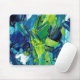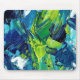 Flowing abstract design of wide brush strokes of blue with a touch of neon looking bright green that adds a pop to the entire design.