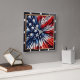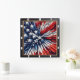 This unique square wall clock features a dynamic, abstract interpretation of the American flag. Red and blue spikes radiate from a cluster of white stars, creating a patriotic yet modern design. The clear black numerals contrast against the vibrant background, making it a stylish and functional piece of home decor.