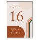 Modern boho wedding table numbers with arch shapes in terracotta, rust, burnt orange, and dark green, emerald tones.