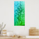 This artwork is a vertical abstract piece featuring a gradient of blues and greens. The colours transition smoothly from a deep, calming blue at the top to a vibrant green at the bottom. A distinctive white line runs straight down the centre of the piece, adding a sense of depth and division. The surface texture is rich, with circulat and organic shapes scattered throughout the, giving a sense of fluidity and movement. The overall effect is serene and reminiscent of underwater scenes or natural textures.